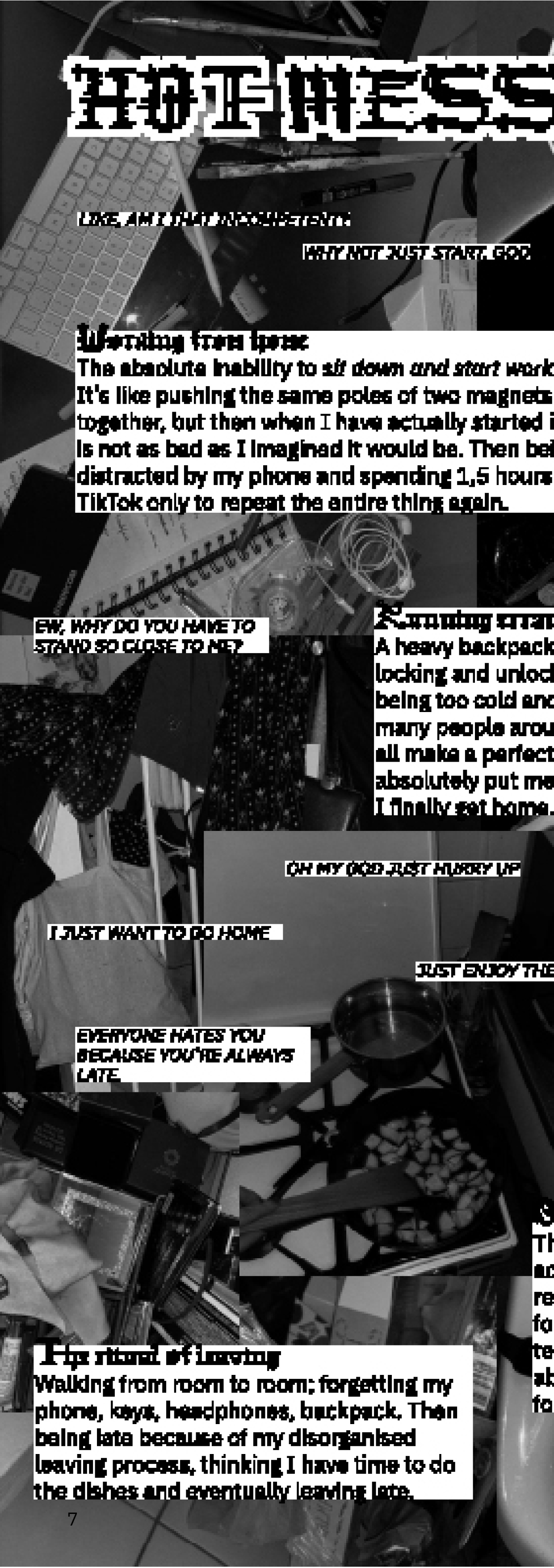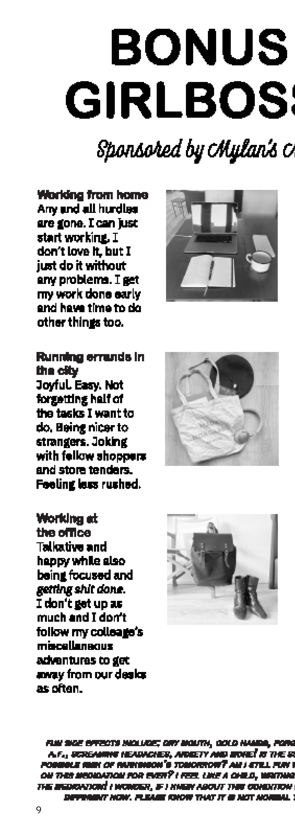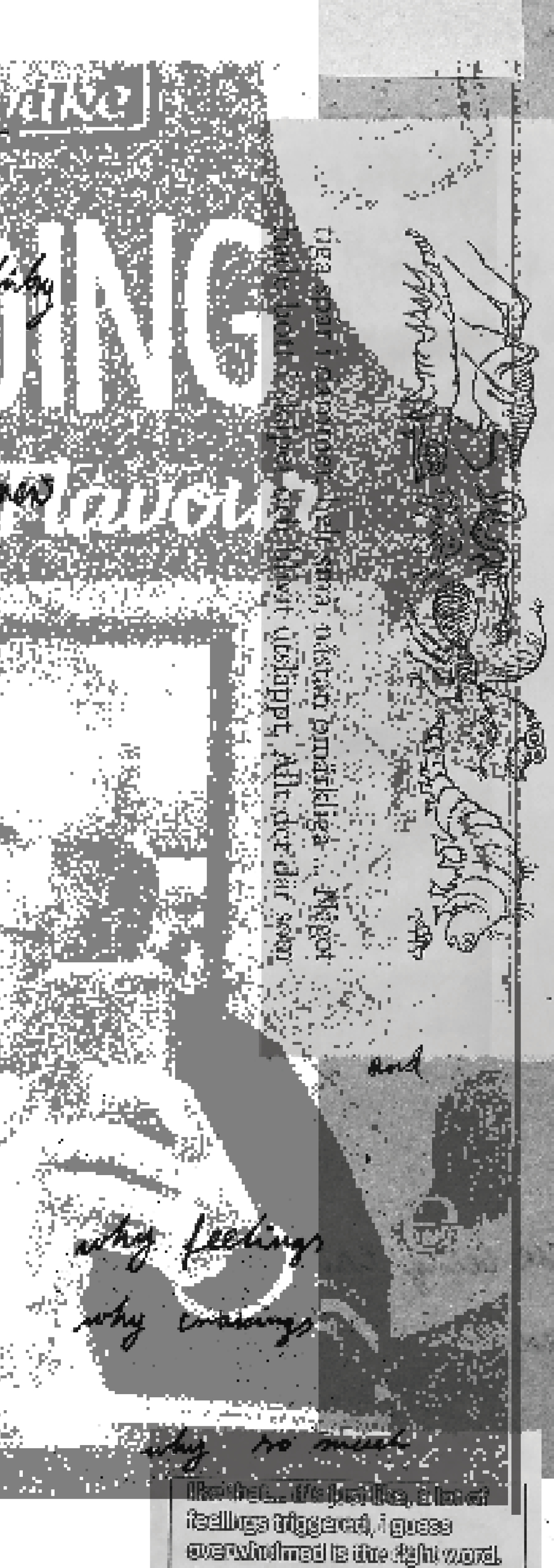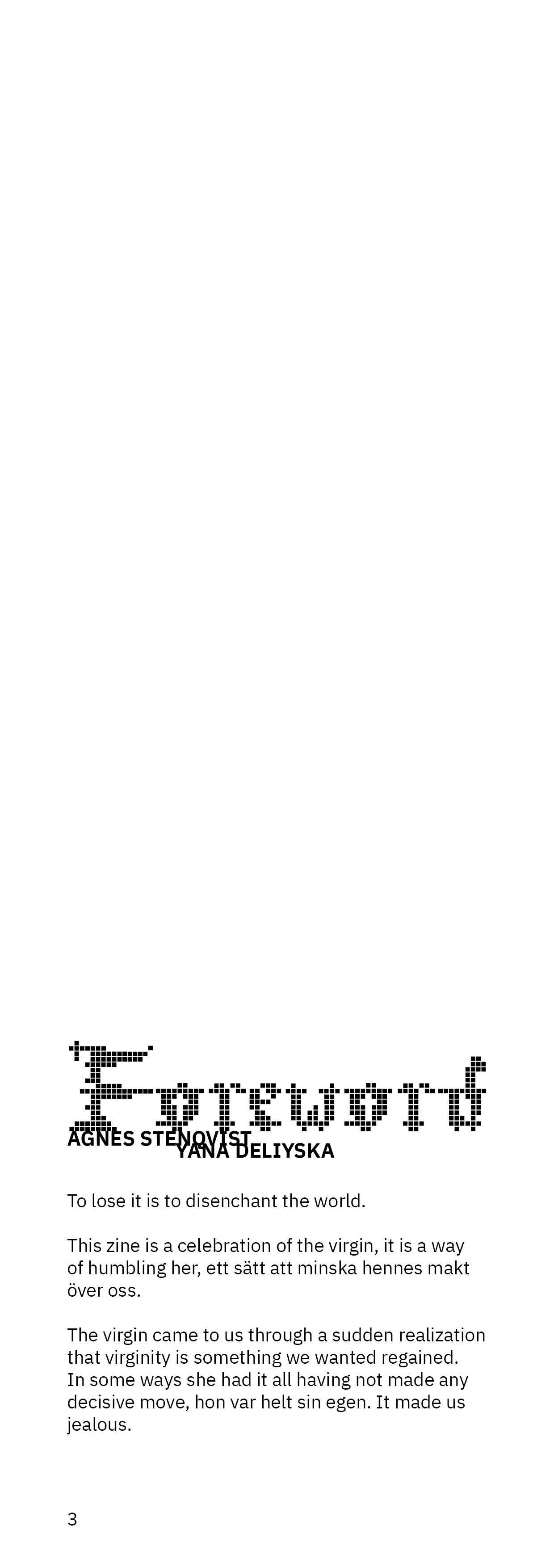 This is a preview of the zine. It is staple-bound; printed on riso, therefore the colors are black and white in digital format, but the printed copy is black and magenta on off-white paper.