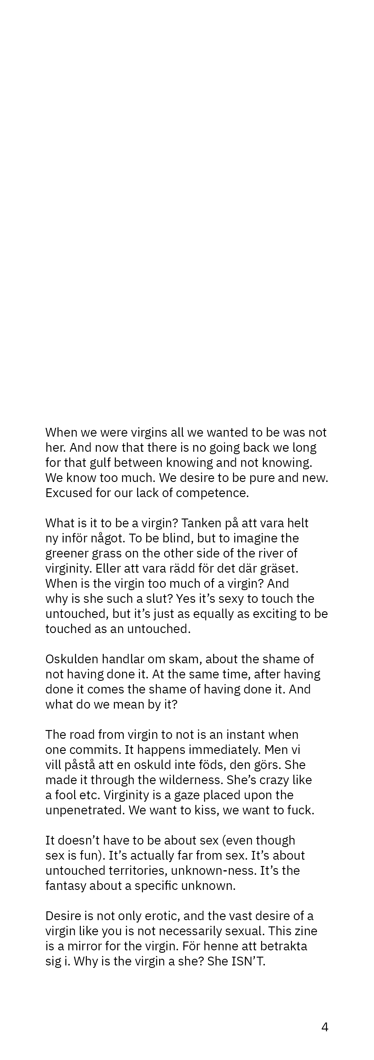 The debut issue of Virgin zine follows the theme Virgin. It is a celebration of firsts. We invited visual artists and writers to give us back our virginity or take it away, to show us what it is to be touched as if for the first time.