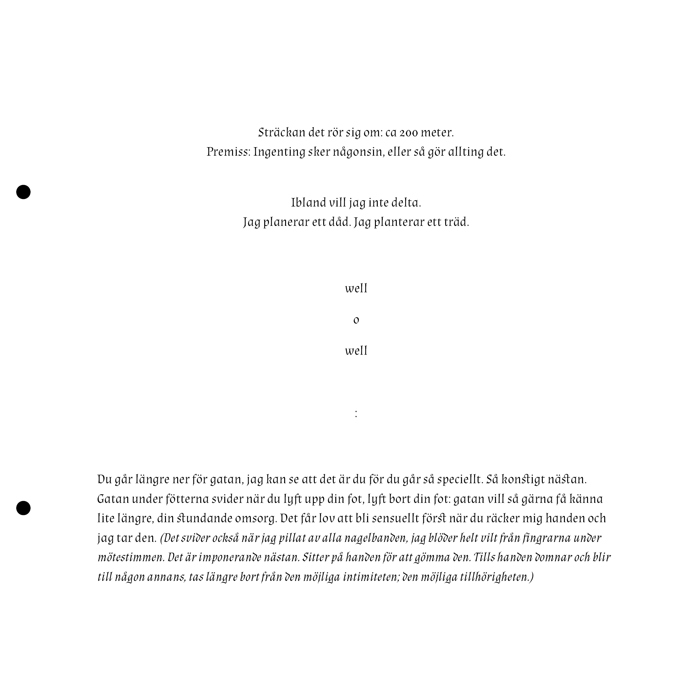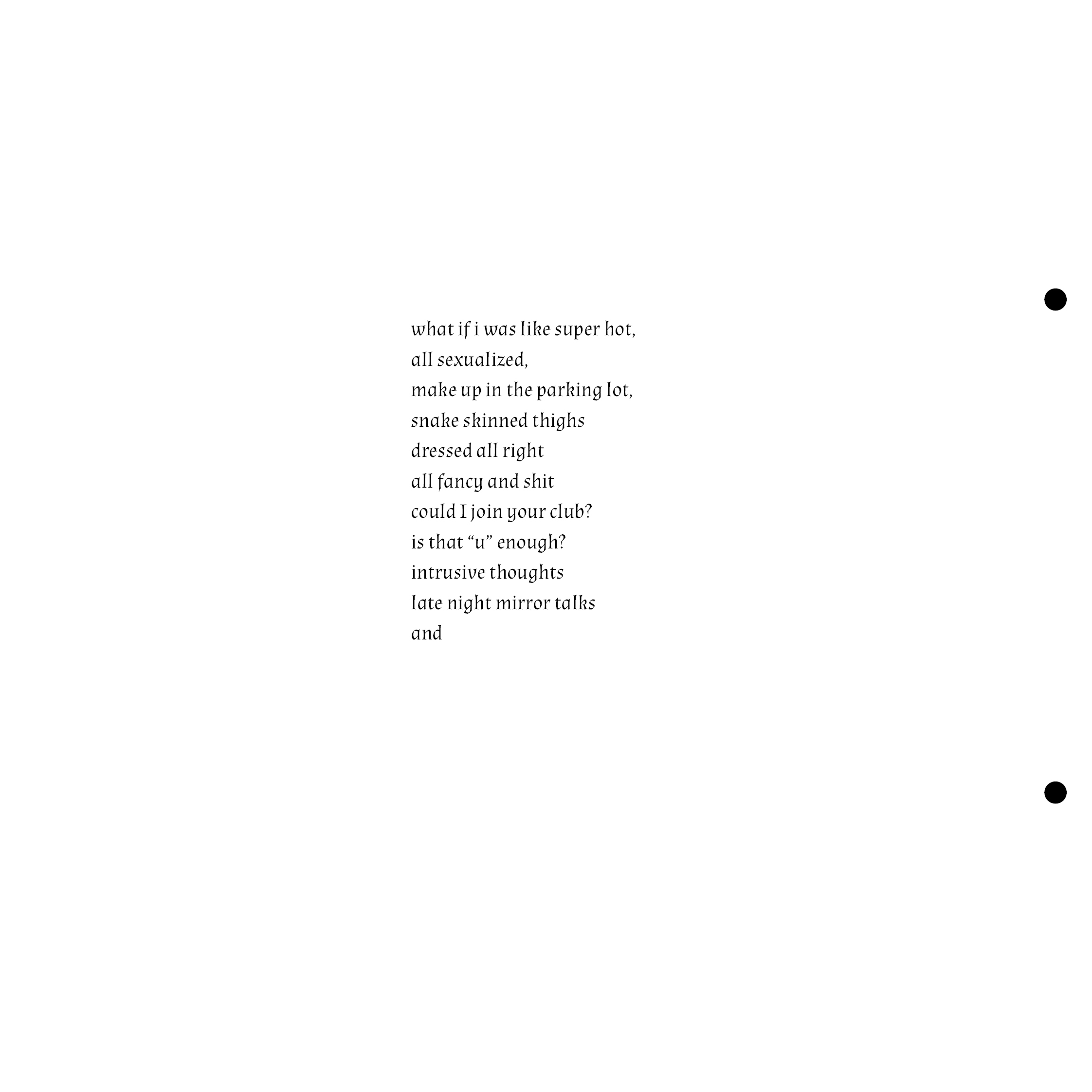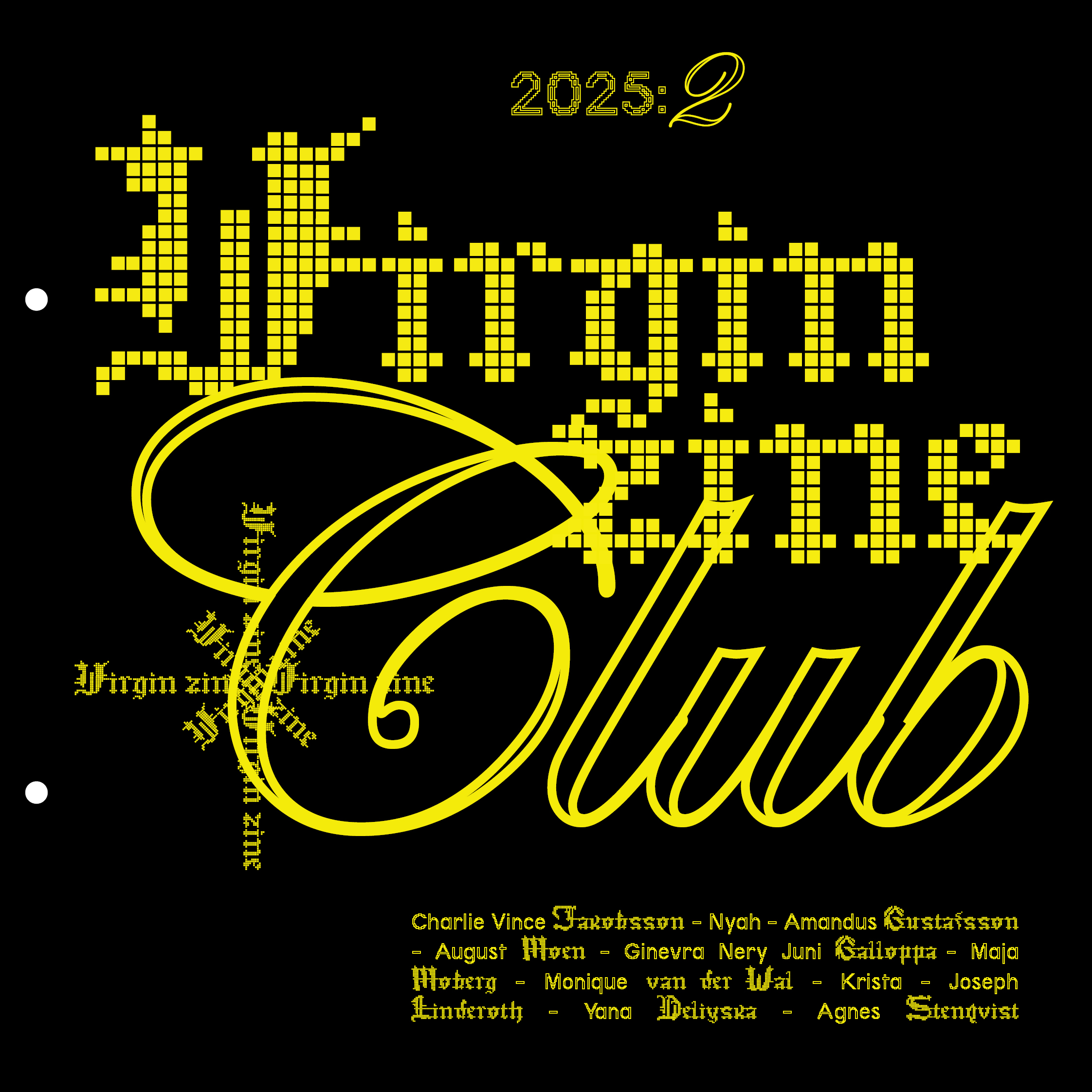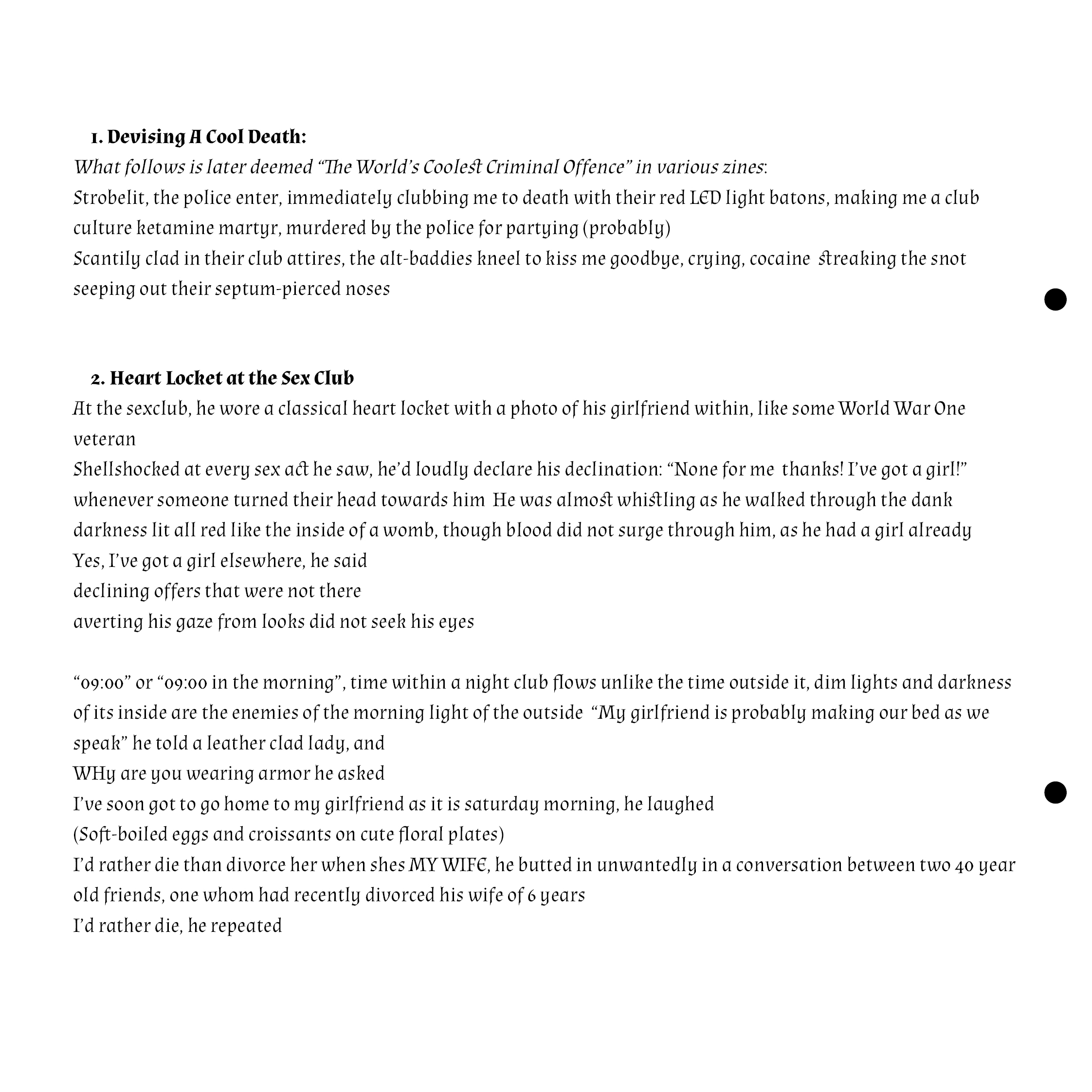 This is a preview of the zine. It is bound together with two metal hooks so in the digital format there are two dots where the holes should be. It is laser-printed in colour.