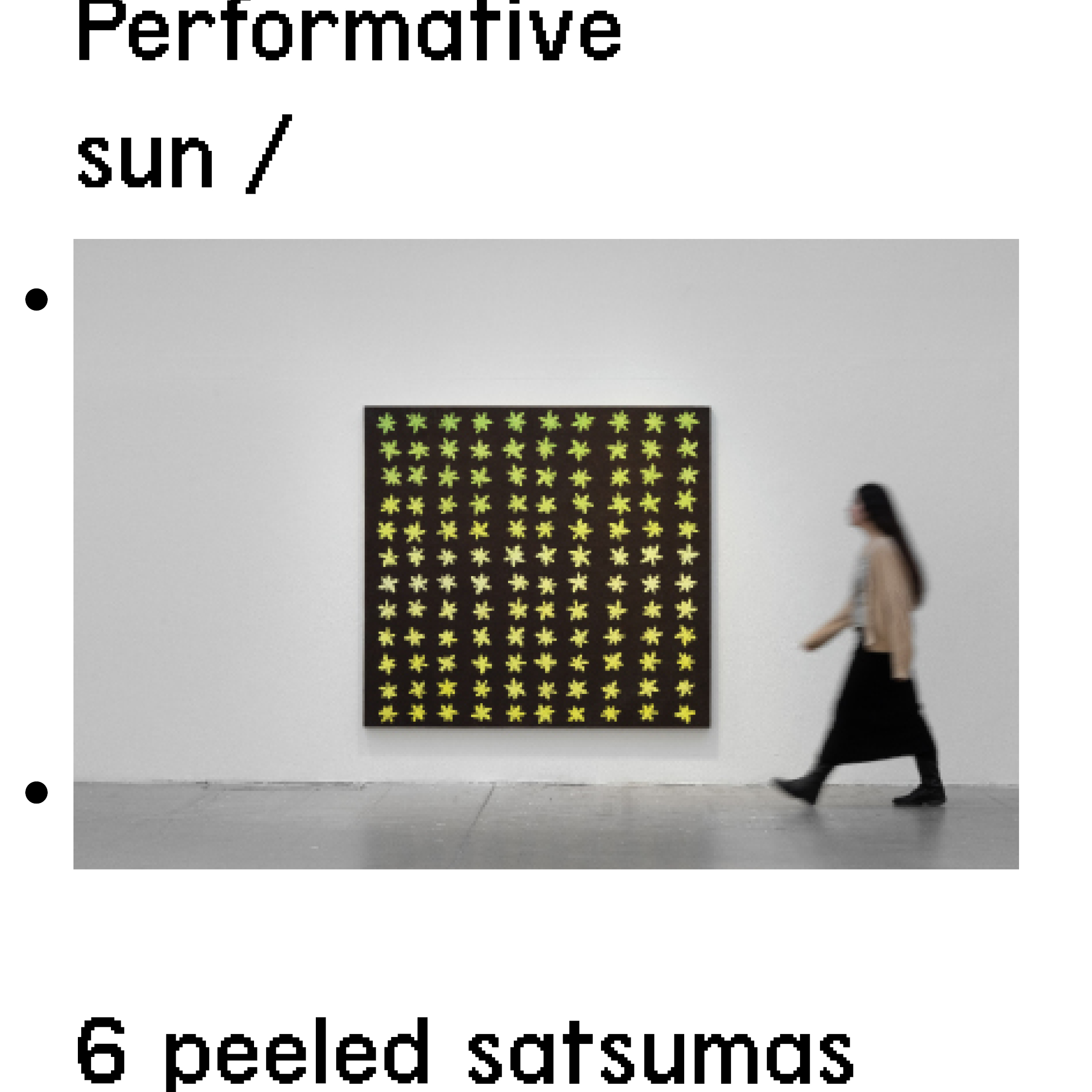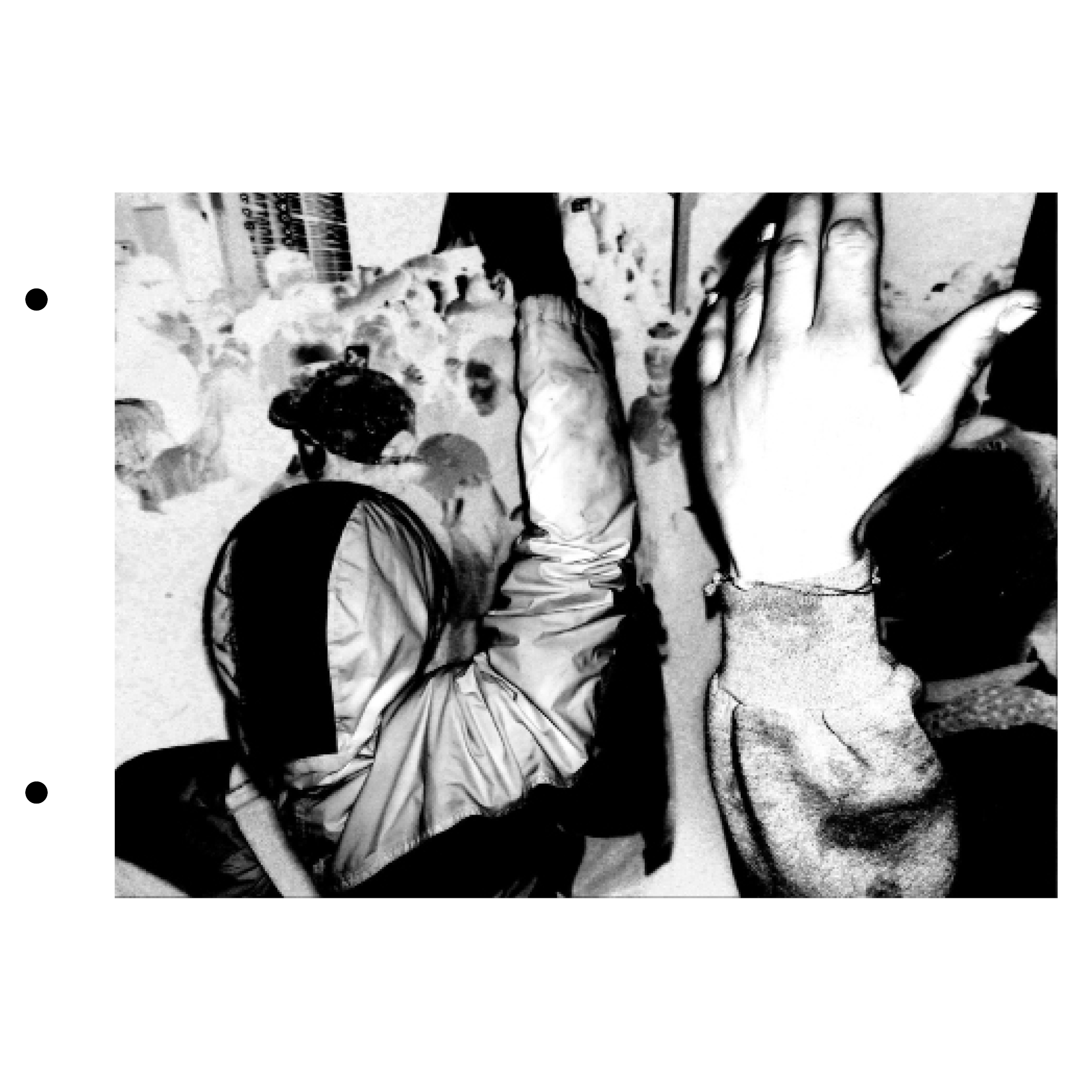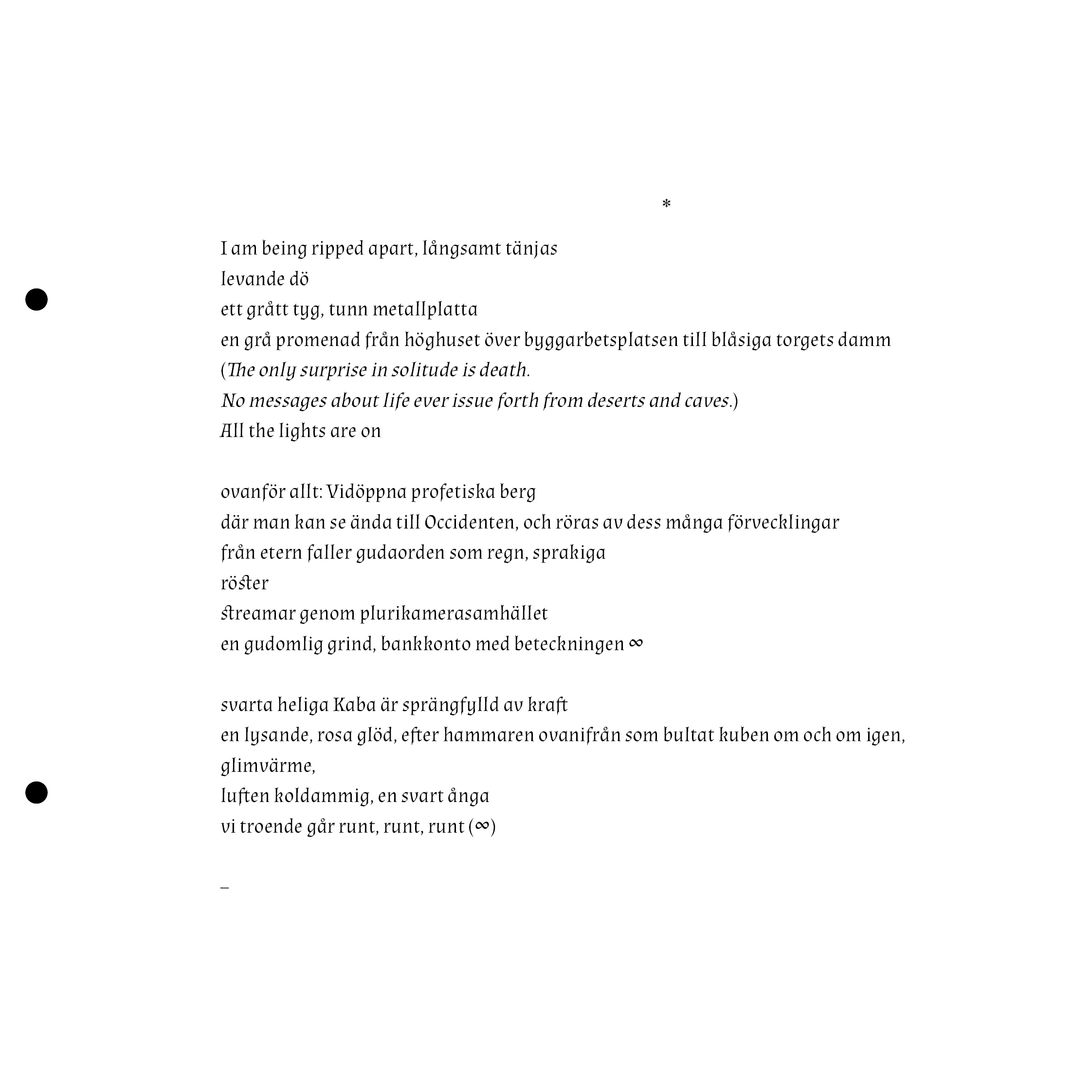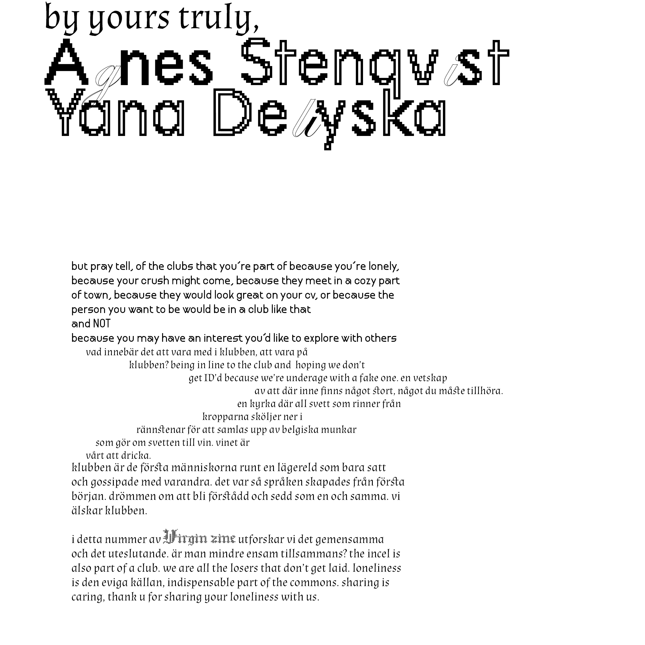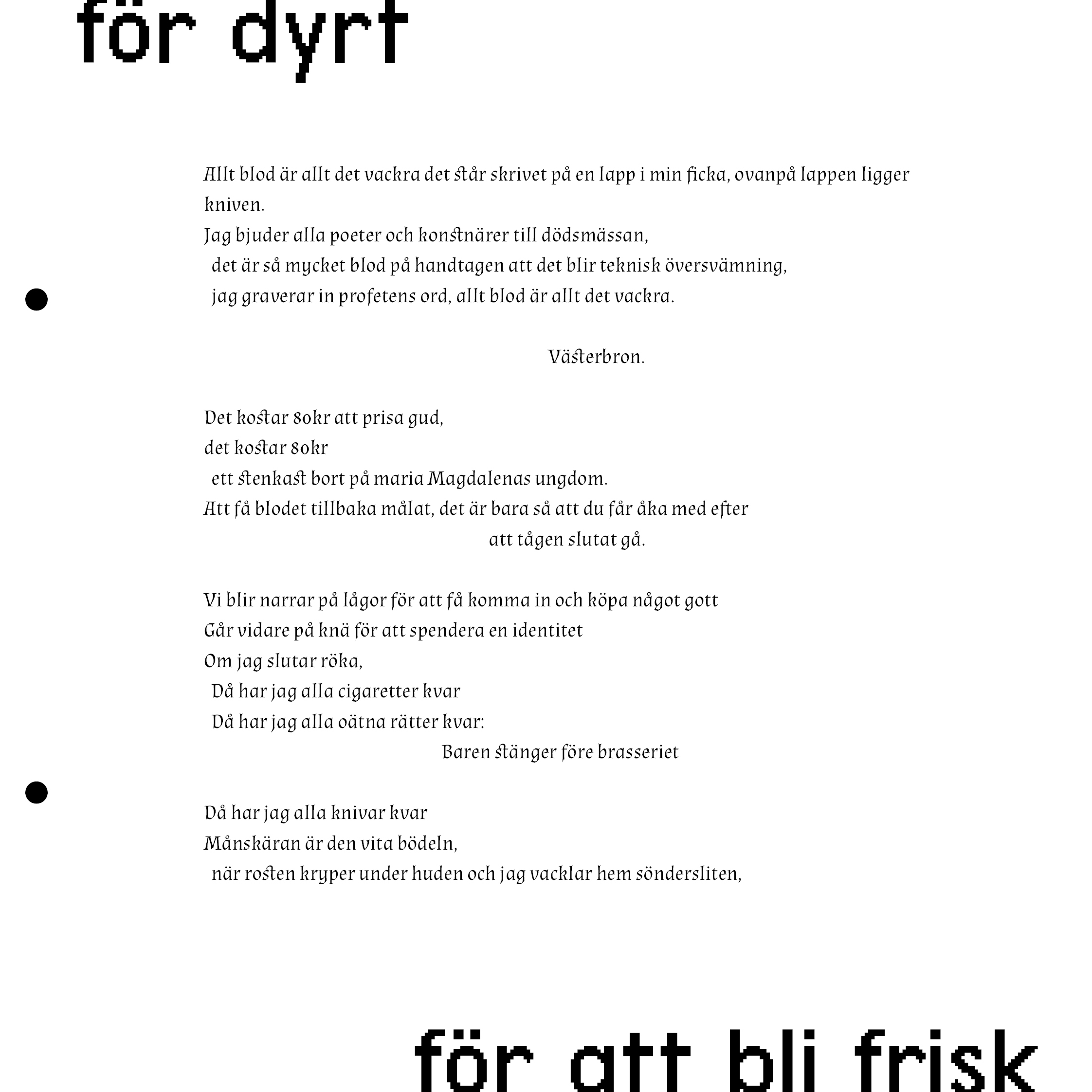This is a preview of the zine. It is bound together with two metal hooks so in the digital format there are two dots where the holes should be. It is laser-printed in colour.